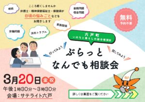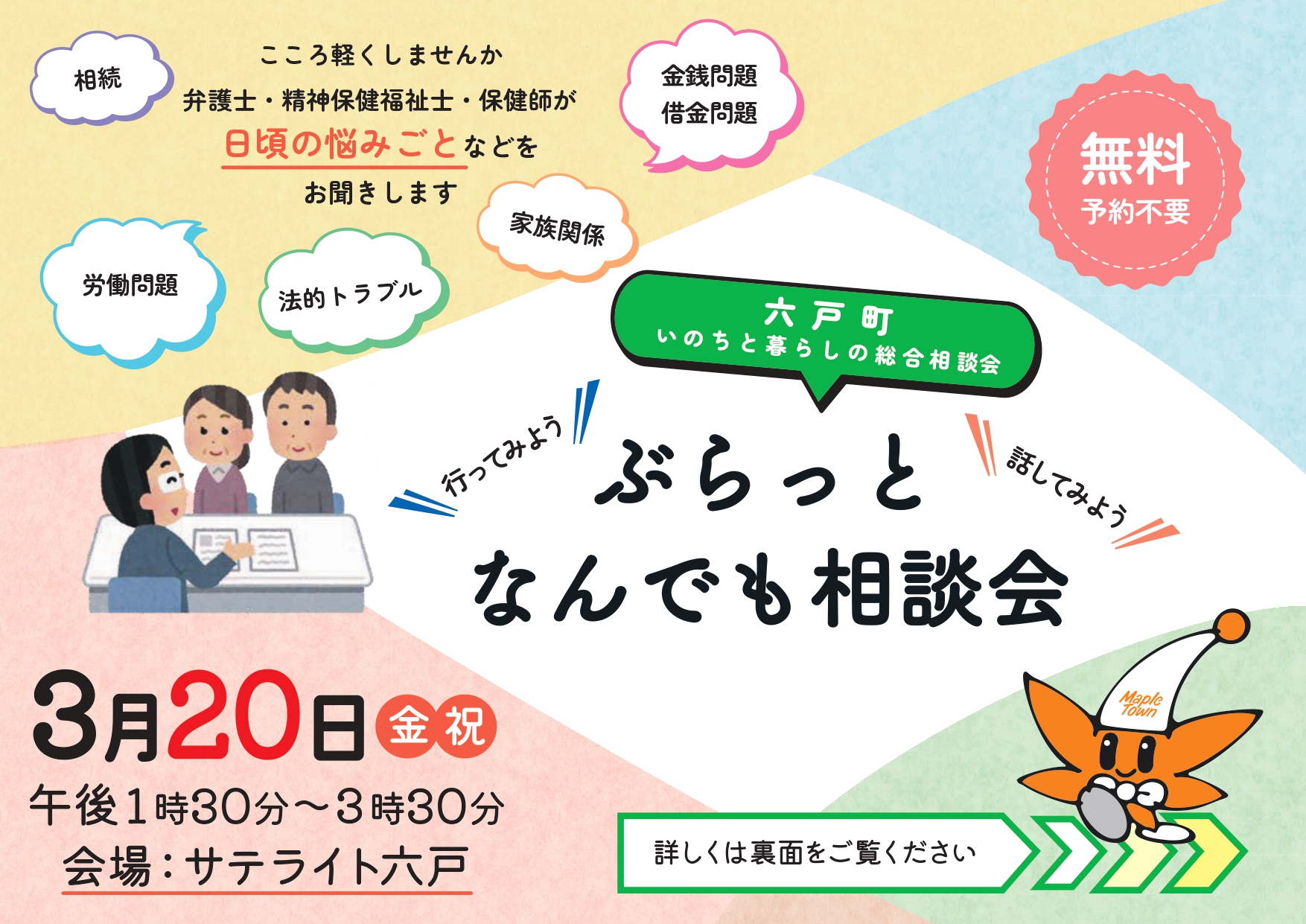 六戸町による『ぶらっとなんでも相談会』の開催! イベント 2026.02.243月20日(金)六戸町 による『ぶらっとなんでも相談会』をサテライト六戸 で開催します! お悩み相談を受け付けておりますので、お気軽に起こしください(^^♪ 「なべっこだんご」のおふるまいもありますよ~!(^^)!