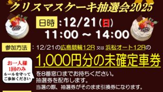 おしらせ週末グレード情報!12月3週目 12月3週目グレード情報!今週末は・・・【競輪】12/20~23 GⅢ「広島記念競輪」【オートレース】12/17~21 GⅠ「スピード王決定戦(浜松)」競輪「広島記念」の地元参戦選手は★新山響平選手★磯島成介選手そして、12/21(土)には... 2025.12.18おしらせ